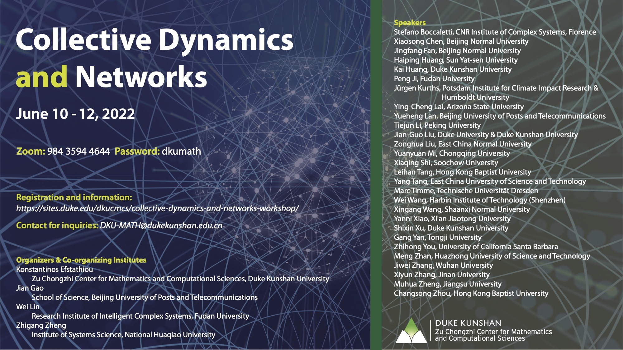 From June 10 to June 12, 2022 we are organizing an exciting online workshop on Collective Dynamics and Networks at the Zu Chongzhi Center for Mathematics and Computational Sciences. My co-organizers are Jian Gao, Wei Lin, and Zhigang Zheng. We have a collection of great talks covering a wide variety of topics related to collective dynamics, networks, and their applications in several domains. More information and registration are available at https://sites.duke.edu/dkucmcs/collective-dynamics-and-networks-workshop/.